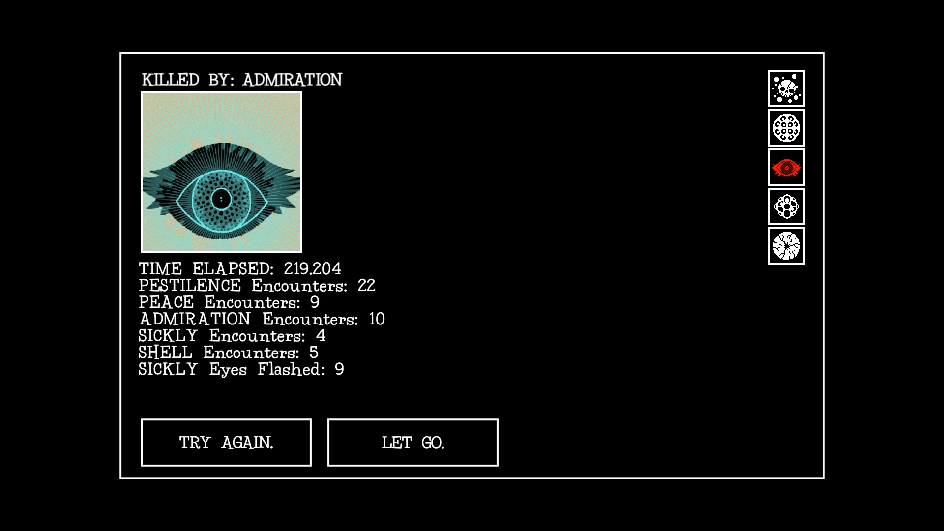 Admiration forms in the dark, its eye glowing from afar. When its eye is fully opened, Admiration will entrance you, pulling your light towards itself in place of your cursor. When spotted, make sure your light is far away from it, as if your light is pulled too close, it will end your game.